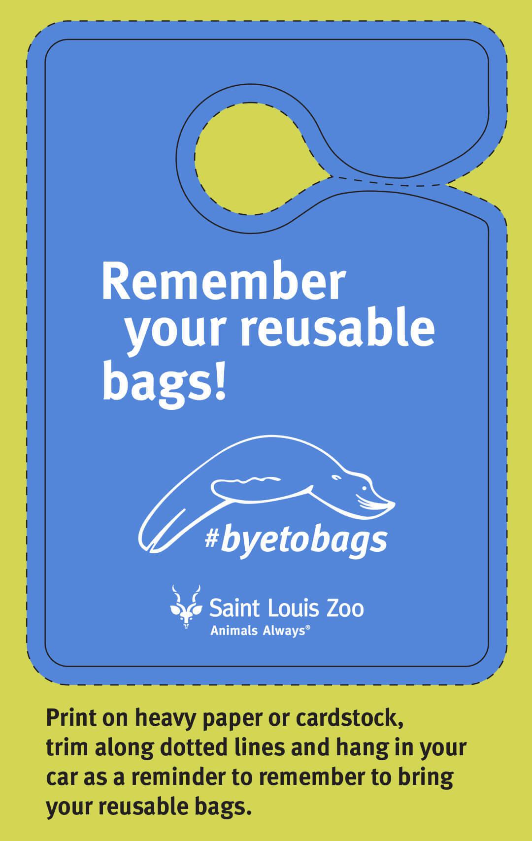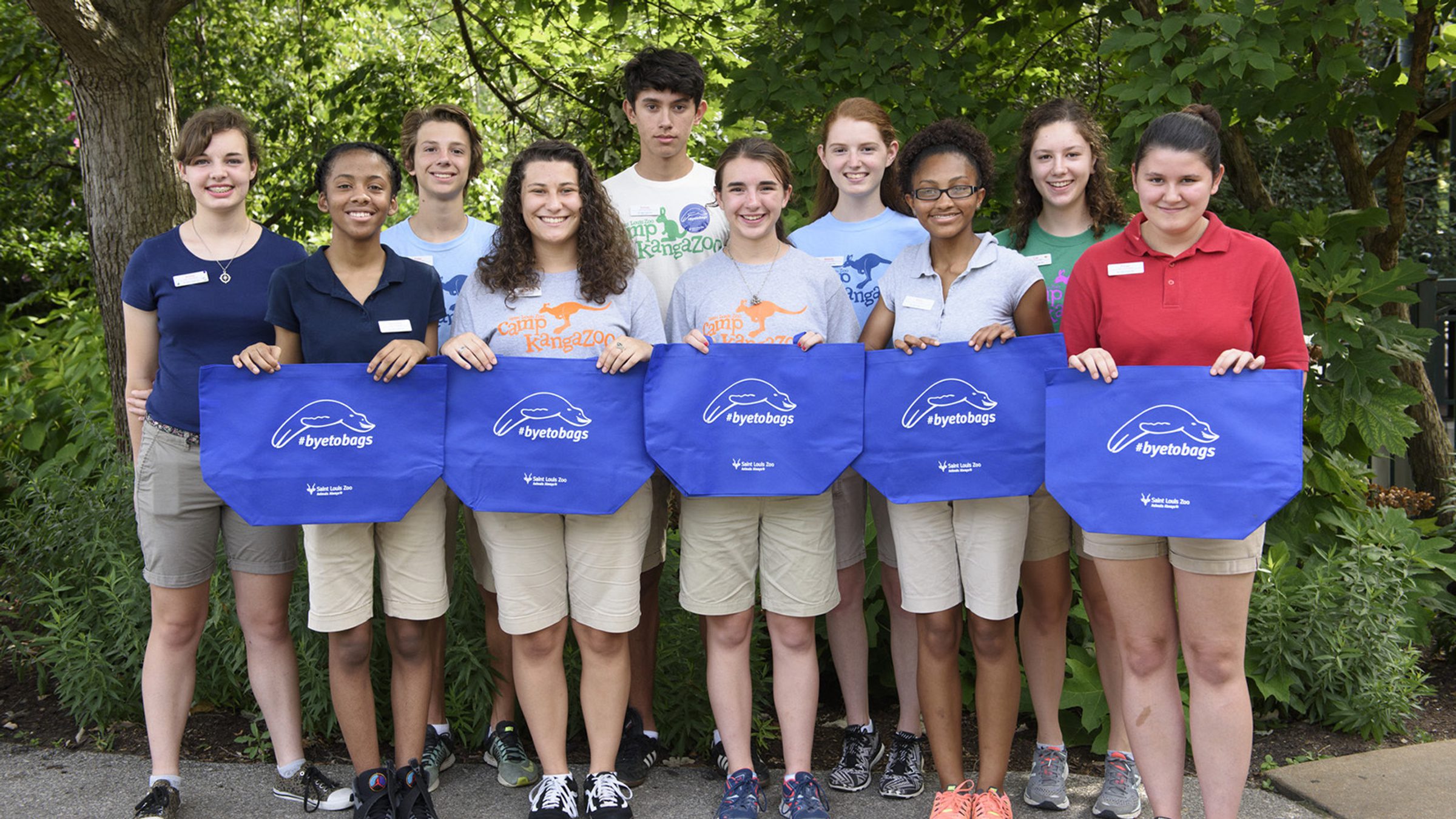 The #byetobags campaign was designed and organized by Zoo ALIVE teen volunteers in January 2016 through a partnership with The Ocean Project. Subsequent support for the campaign has been provided by generous donors to the Saint Louis Zoo. The teens chose plastic bags to be the focus of the campaign after researching the negative effects of plastic on many species of animals. Their goal was to highlight our ability to impact ocean health, even from the Midwest, through simple, solution-oriented action—using reusable bags instead of plastic.