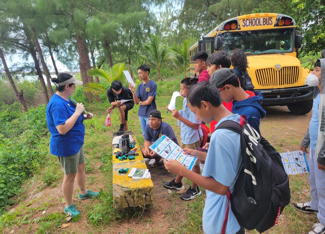 One relationship PBC has grown over the years has been with the CNMI Public School System. Through workshops and conversations with teachers, we learned that exposing high school students to conservation careers through our school programs was an important goal. To respond to this desire, PBC educator and Saint Louis Zoo education liaison Keri Lammering developed a half-day immersive experience. Students travel to the semi-remote field site where birds are collected and then hop back on the bus to the bird care room in town. Guided by PBC staff, students rotate in groups of three to learn about field techniques, engage in bird watching, how birds are kept in human care before being released to the satellite islands, and about the variety of conservation careers that are involved in this work.