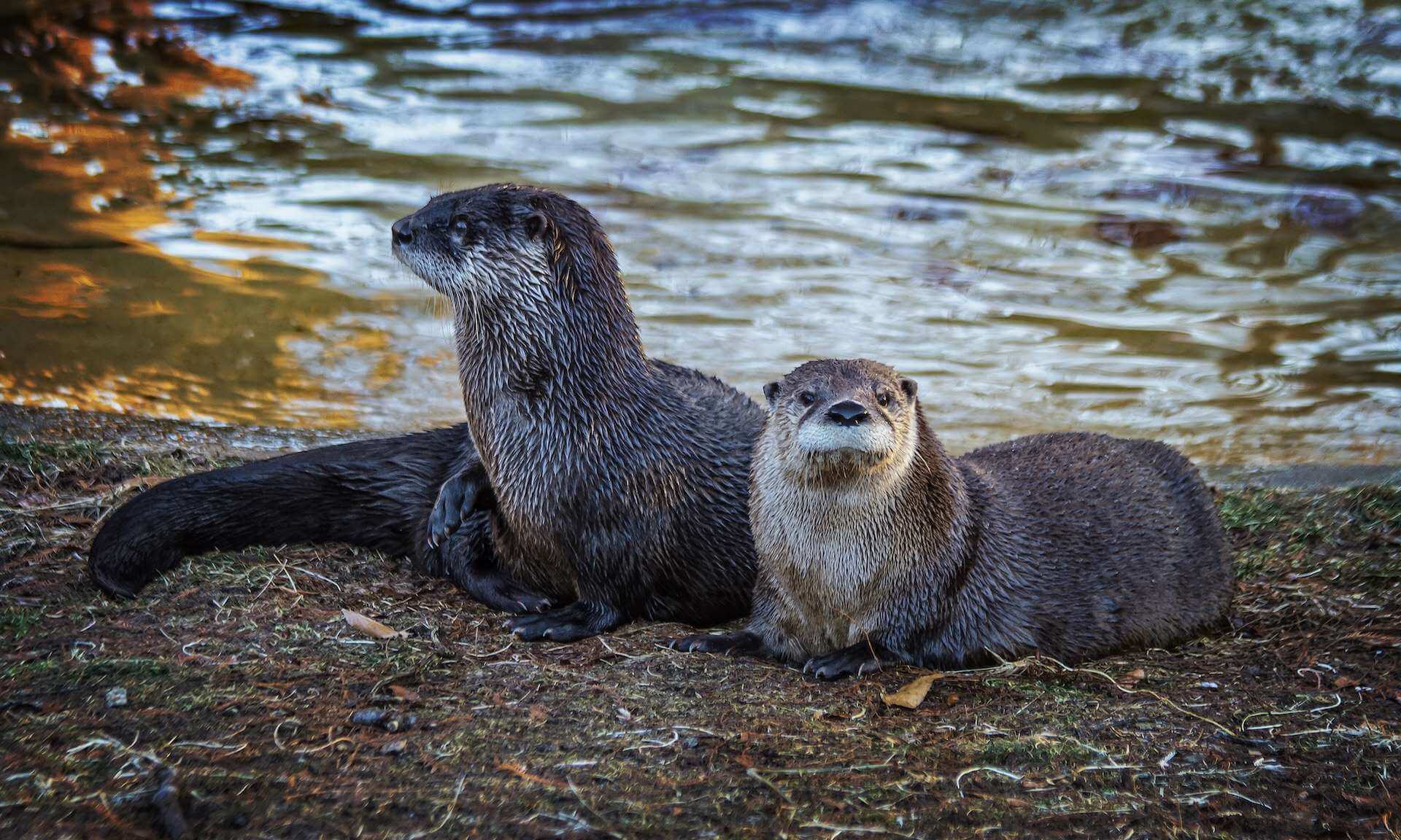 North American river otters — Guests can spot North American river otters zooming by windows or swimming overhead through two acrylic water flumes above the walking path.