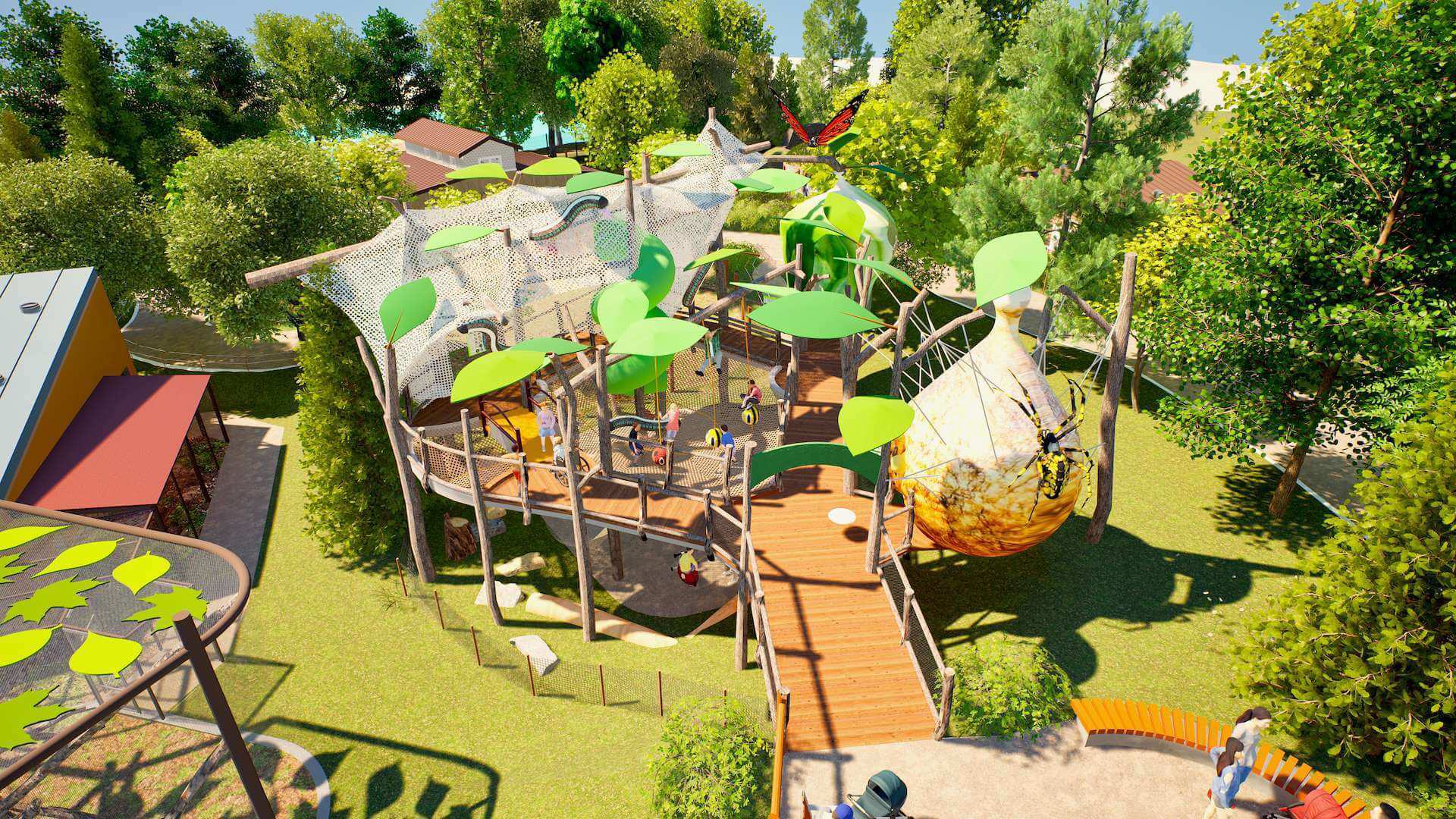 At this multi-level playscape with an invertebrate theme, young guests can climb into a huge monarch chrysalis, bounce on a supersized spiderweb, slide down a caterpillar slide and swing on a lacewing egg.