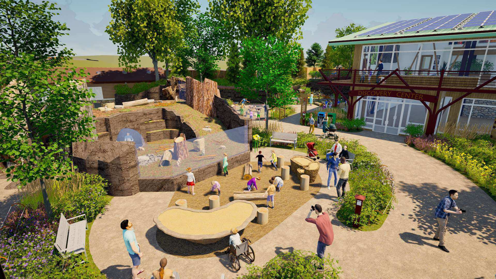 The Discovery Center on the ground level will be an indoor play space where guests can learn about caring for and sharing with wildlife neighbors. The areas will include a maker’s space that will allow guests to create things to help wildlife, an animal pretend play zone, a nature exchange, a habitat building activity, a dedicated indoor animal encounter area and more.