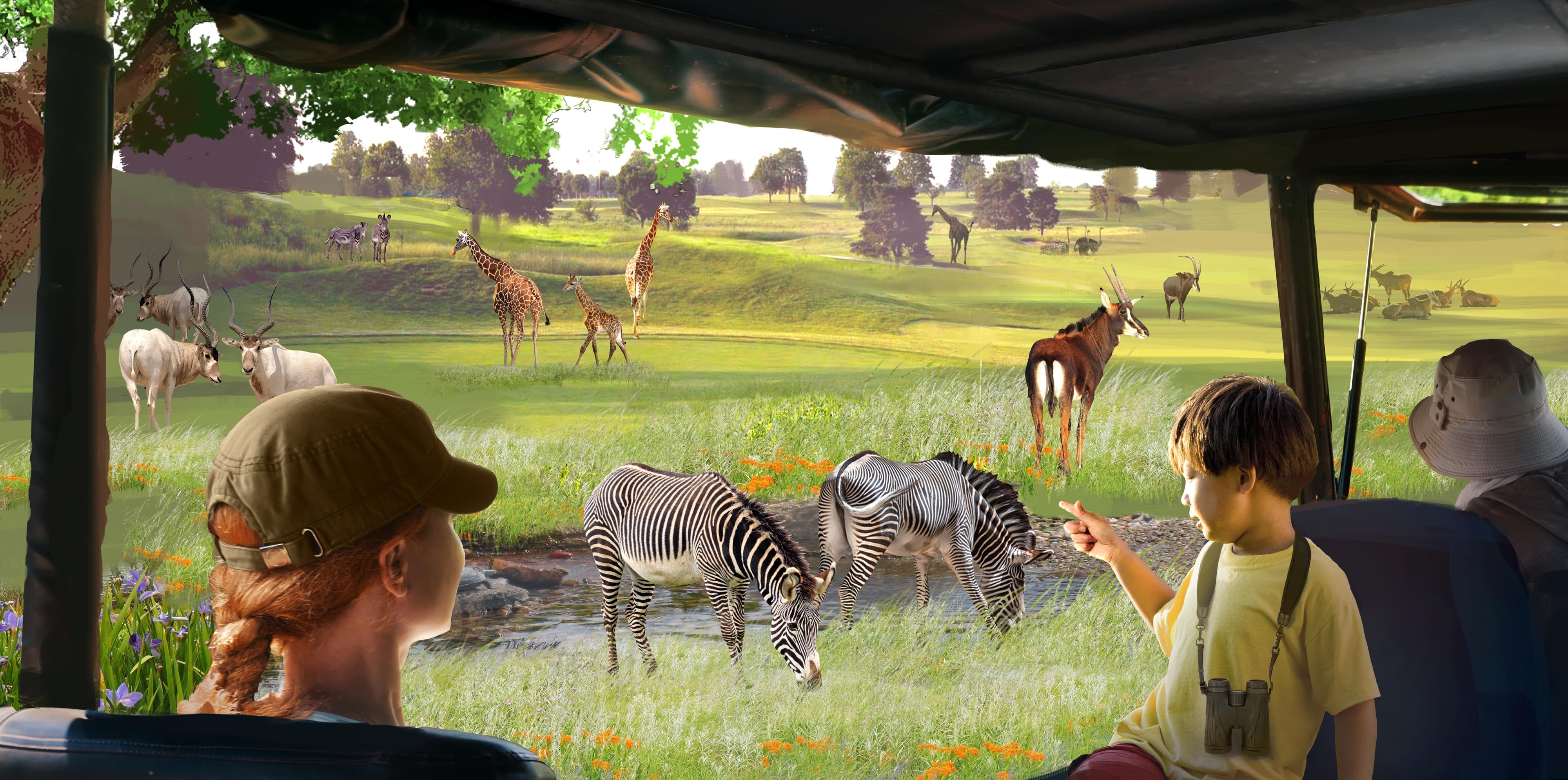 - Savanna Safari – This 101-acre pasture looks more like a traditional savanna with large grassy areas dotted with trees and includes several lakes and ponds. From a safari vehicle, guests can enjoy viewing approximately 100 animals, including a herd of up to 20 giraffes as well as ungulates like Grevy's zebra, banteng, greater kudu, scimitar-horned oryx, and waterbucks.